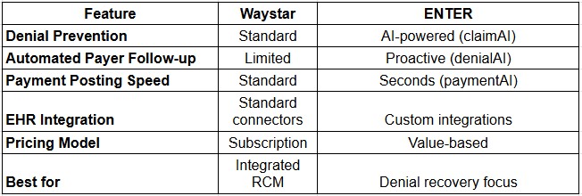 Waystar excels in claims management and payer connectivity, while ENTER specializes in AI-powered denial recovery with automated follow-up. Choose Waystar for broad RCM functionality; choose ENTER if denial prevention and underpayment recovery are your top priorities.